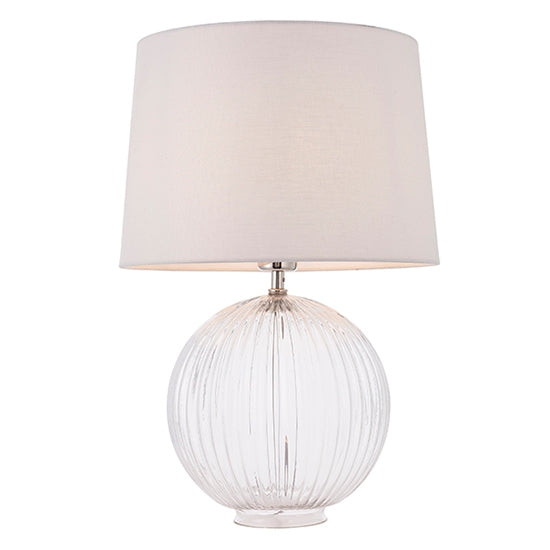 Incorporates 10% saving when base and shade bought together. A striking table lamp with a distinctive clear ribbed sphere glass base, finished with satin nickel fittings. Paired with the Mia Vintage White 100% linen shade to complete the look.