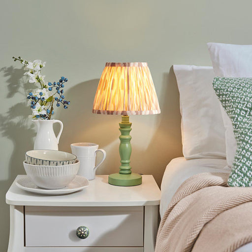 View full detailsBibury And Ikat 20cm Coral Pink Fabric Shade Table Lamp In Satin Cotswold Green