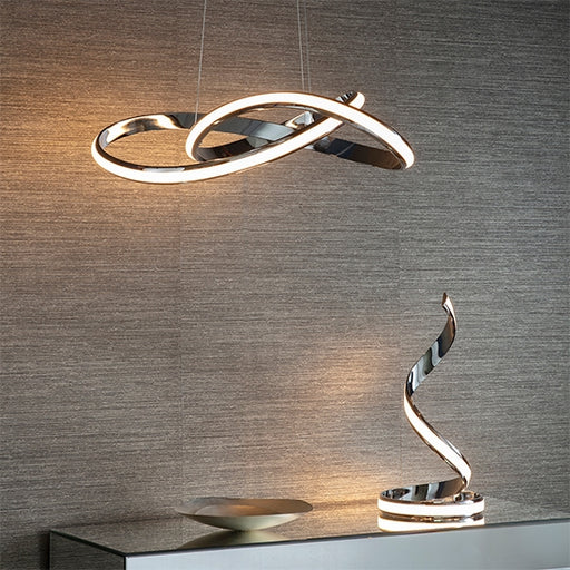 Elegant Lighting UKA unique contemporary ceiling pendant with flowing illuminated curves, height adjustable, suspended from thin wire cables creating an amazing desig...