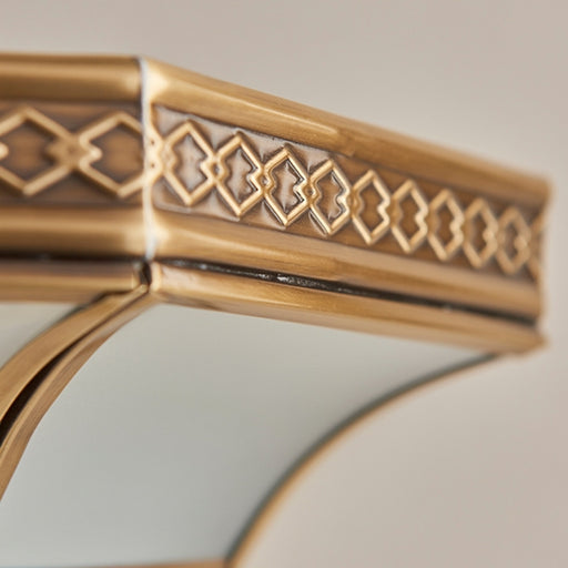 Elegant Lighting UKA traditional style wall light finished in antique brass, with an embossed pattern and frosted glass panels. Dimmable and compatible with LED lamps...
