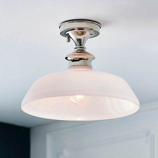 View full detailsBarford Gloss Opal Glass Shade Semi Flush Ceiling Light In Bright Nickel