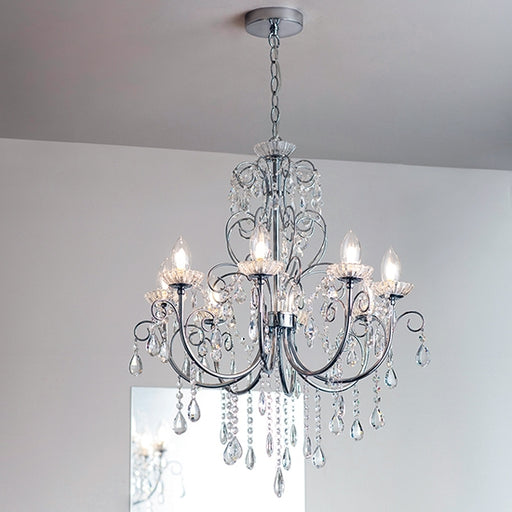 Elegant Lighting UKThe Tabitha 8 light pendant fitting is finished in a chrome effect plate with clear crystal glass detail and droplets. IP44 rated so suitable for u...