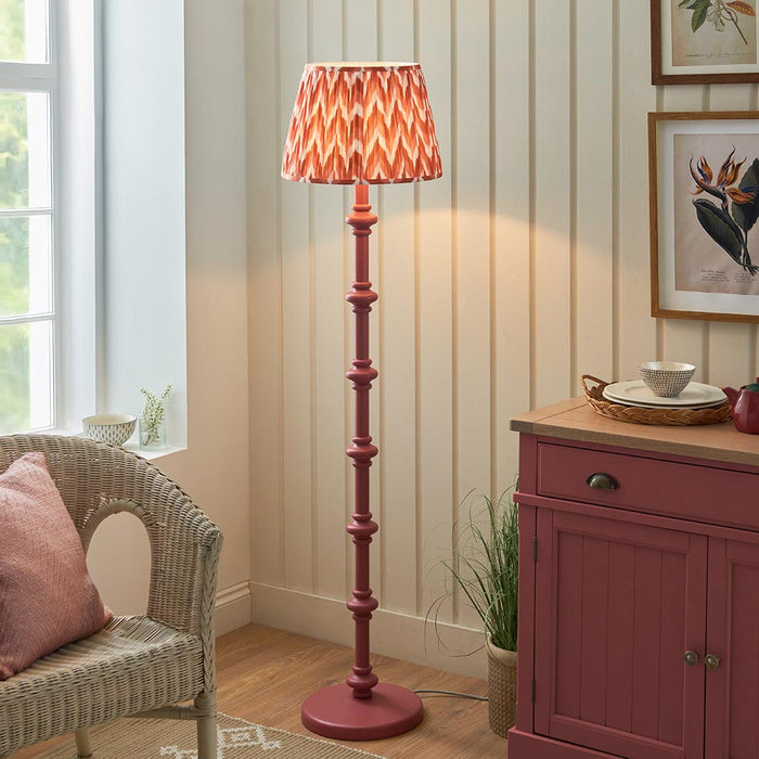 This unique wooden turned spindle floor light is inspired by past design styles with a fresh update. Painted in classic satin Pink Clay, with a brass B22 switched lamp holder and grey braided fabric flex. Each product is turned on a wood lathe by hand and will be unique; any variants in finish are part of the individual charm of the product. This floor light is finished with our bright apricot orange 40cm Zigzag shade for a unique, classic style.