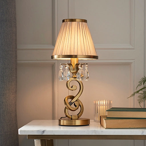 Elegant Lighting UKA small table lamp from the Oksana Antique Brass range. Features faceted lead crystal droplets, a decorative stem base and a Beige pleated shade wi...