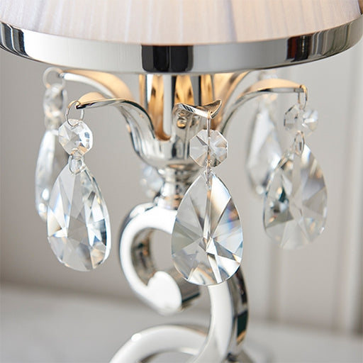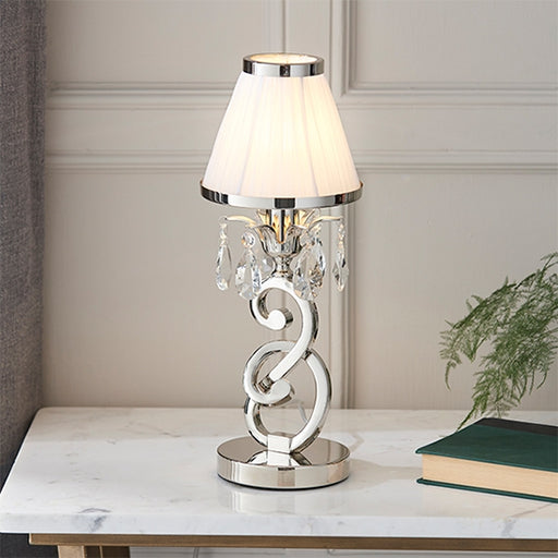 Elegant Lighting UKA small table lamp from the Oksana nickel range. Features faceted lead crystal droplets, a decorative stem base and a White pleated shade with a po...