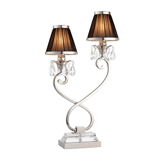 Elegant Lighting UKA twin table lamp from the Oksana nickel range. Features faceted lead crystal droplets, a decorative double armed stem base and black pleated shade...