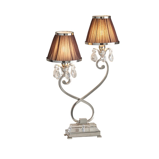 Elegant Lighting UKA twin table lamp from the Oksana nickel range. Features faceted lead crystal droplets, a decorative double armed stem base and Chocolate pleated s...