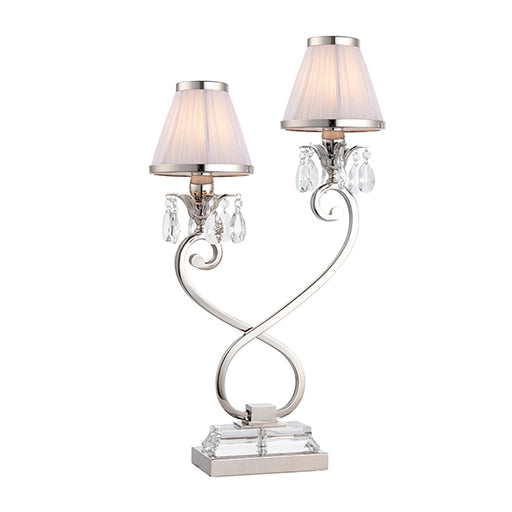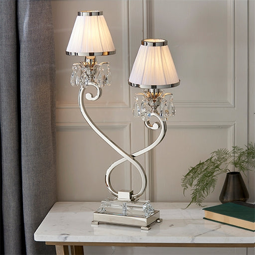 Elegant Lighting UKA twin table lamp from the Oksana nickel range. Features faceted lead crystal droplets, a decorative double armed stem base and White pleated shade...