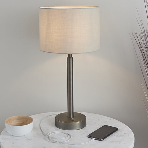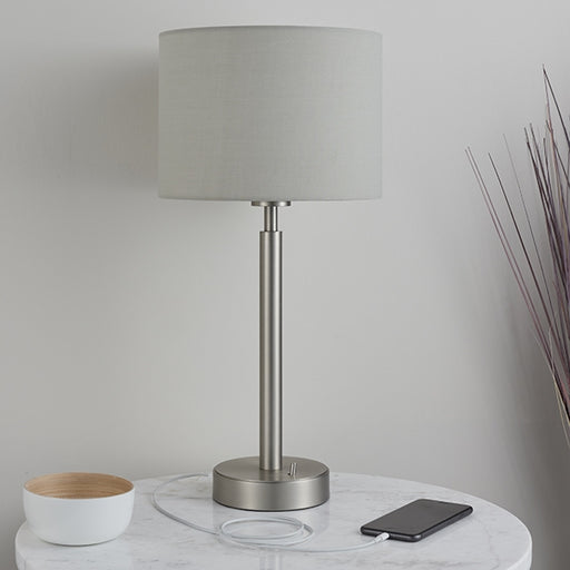 View full detailsOwen Taupe Cylinder Shade Table Lamp With USB In Matt Nickel
