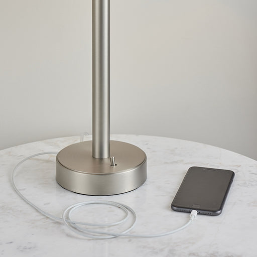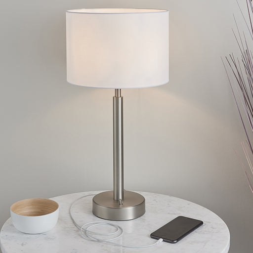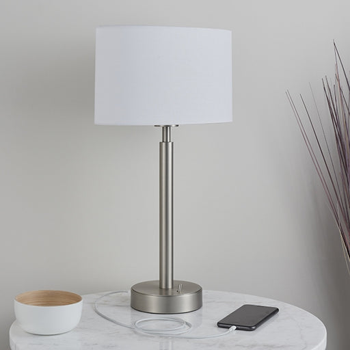 View full detailsOwen White Cylinder Shade Table Lamp With USB In Matt Nickel