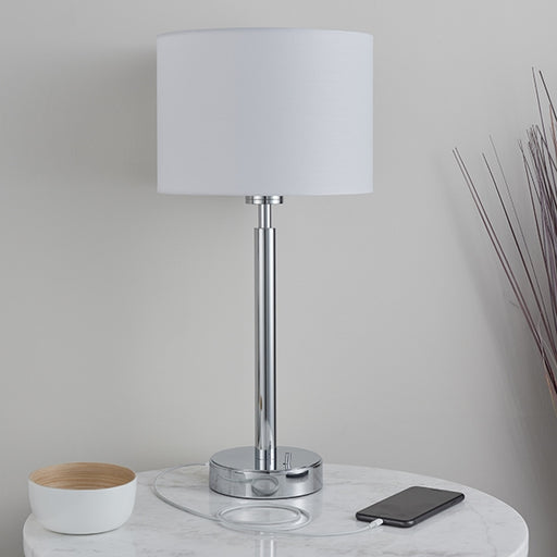 View full detailsOwen White Cylinder Shade Table Lamp With USB In Polished Chrome