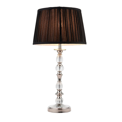 Elegant Lighting UKA small table lamp from the Oksana nickel range. Features faceted lead crystal droplets, a decorative stem base and a black pleated shade with a po...