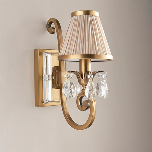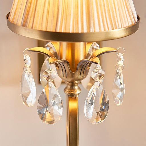 Elegant Lighting UKA single wall light from the Oksana Antique Brass range. Featuring faceted lead crystal droplets, a decorative arm and a Beige pleated shade with a...