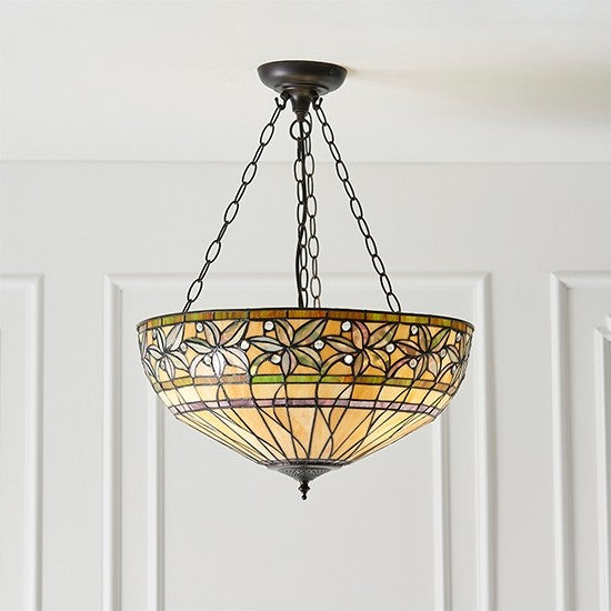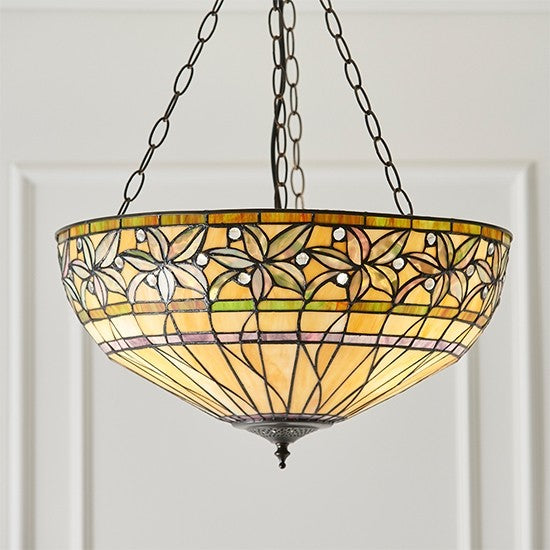 The Ashstead 3 light inverted pendant has a beautiful Tiffany style shade, with a floral border of autumnal colours made from mottled glass. Enhanced by a bronze effect fitting. Matching items available.