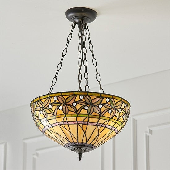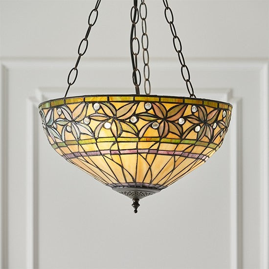 The Ashstead inverted pendant has a beautiful Tiffany style shade, with a floral border of autumnal colours made from mottled glass. Enhanced by a bronze effect fitting. Matching items available.