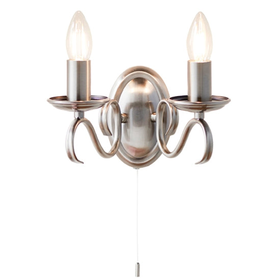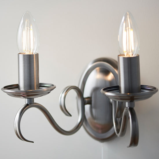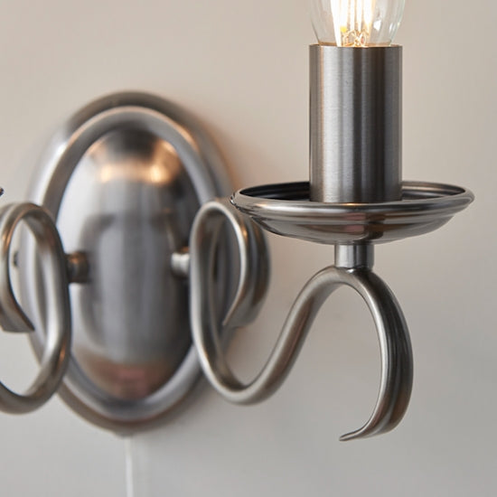 A twin wall light with scrolled arms in antique silver effect finish with pull switch. suitable for use with LED lamps and dimmable. Matching items available and also comes in an antique brass finish.