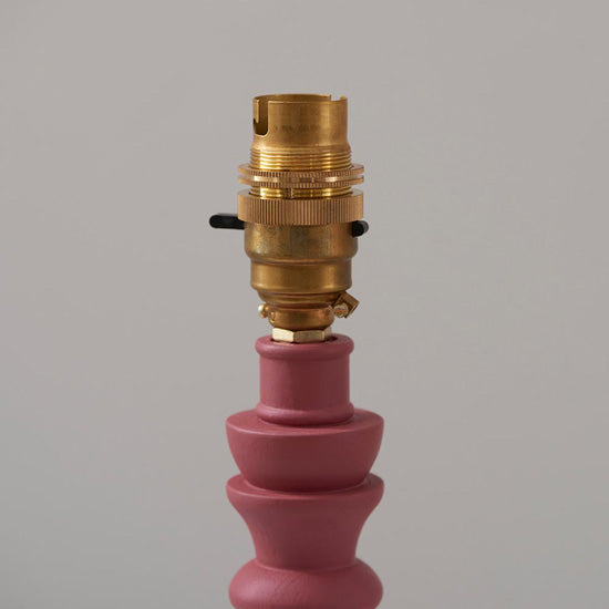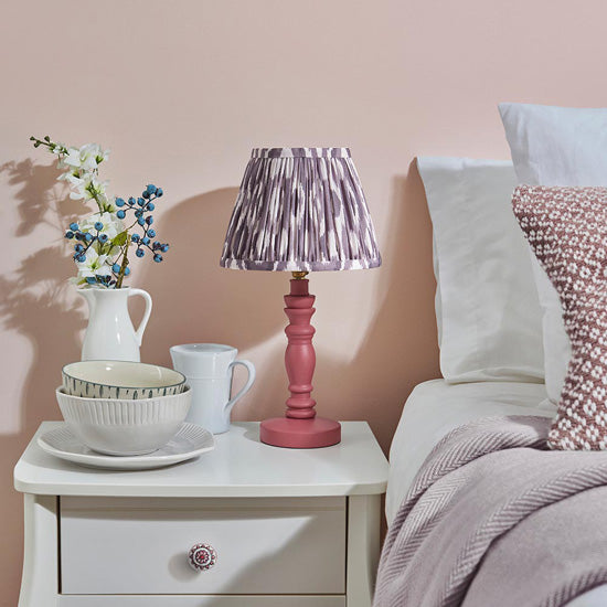 A beautiful wooden turned spindle light, painted satin pink clay. Perfect for classic interiors, featuring a brass B22 switched lamp holder and grey braided fabric flex. Paired with our stylish pearl grey 20cm Ikat shade for a unique, classic look.