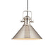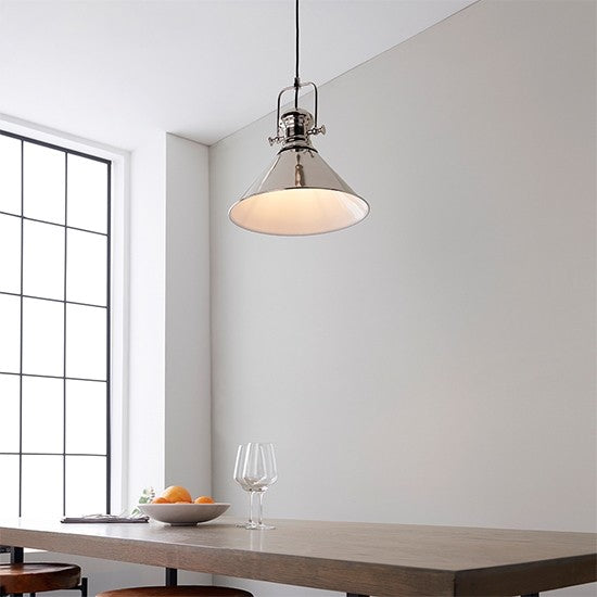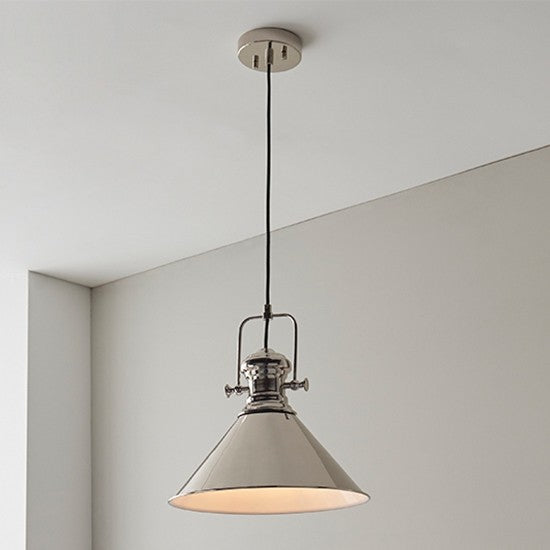 High quality, minimalistic pendant finished in bright nickel and white paint. Suspended by a height adjustable black braided cord. Perfect when paired with LED filament lamps to create striking light patterns.