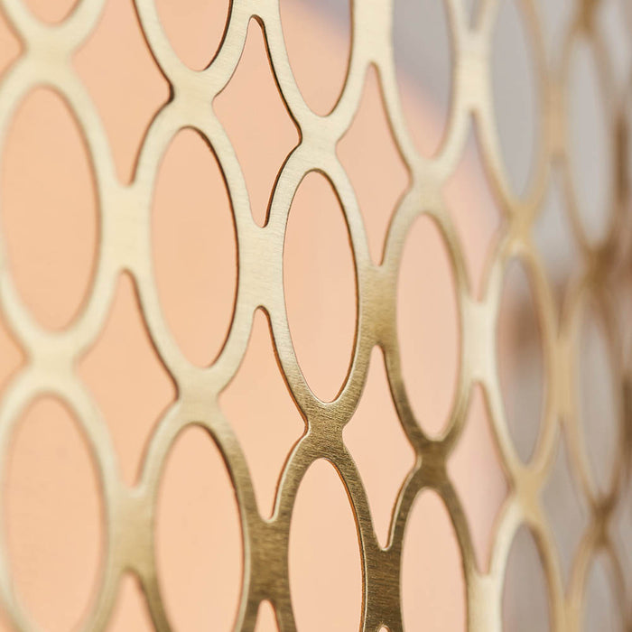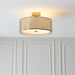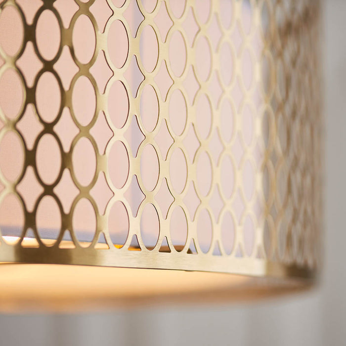 No compromise on design for low ceilings. This is a classic circular light with a trendy geometric fretwork metal outer and an inner fabric shade for lovely light diffusion. In a gold effect plate finish with frosted glass this light would compliment a range of interior style. This product is also dimmable to create a relaxing atmosphere.