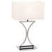 This table lamp features an unusually shaped body atop a rectangle base, all finished in chrome topped with white square shade. suitable for use with LED lamps and supplied with inline switch.
