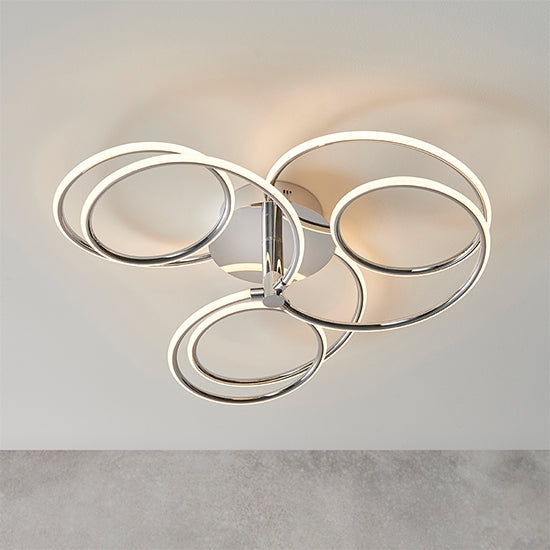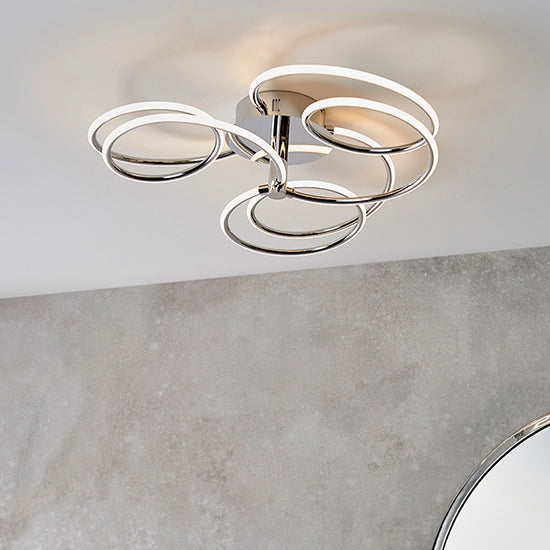 A unique contemporary ceiling light with a trio of flowing illuminated curves creating an amazing designer look. Chrome plated finish with white diffuser and integrated LED.