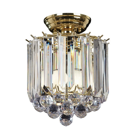 The Fargo flush is finished in brass effect with clear acrylic detailing. This fitting is dimmable and suitable for use with LED lamps. Other fittings and finishes also available within the range.