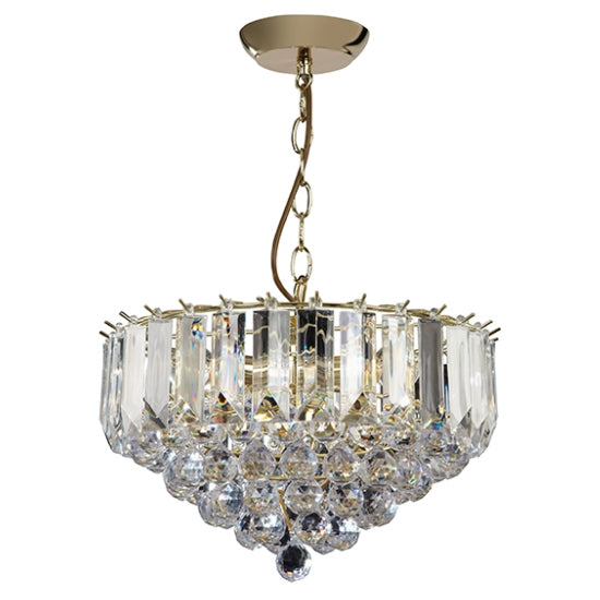 The Fargo pendant is finished in brass effect with clear acrylic detailing. This fitting has a height adjustable drop, is dimmable and suitable for use with LED lamps.