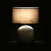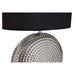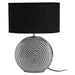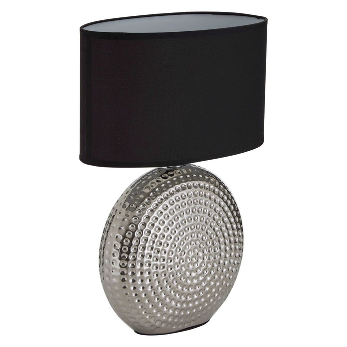 A striking feature even when the light isn't on, ensures the table lamp, with its chic Halm effect, will make a wonderful addition in your home. The circular base is durable, sturdy and with its chrome Halm finish effect the stylish lamp will make a great feature in your home radiating light and elegance into the room. Complementing the base is the chic black fabric shade that will emit a soft warm glow to the surrounding area. The eye-catching table lamp will complement a modern setting while enlightening the room. A sleek ceramic table lamp that adds boutique hotel style to the living room or bedroom.