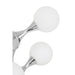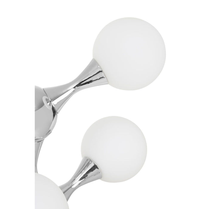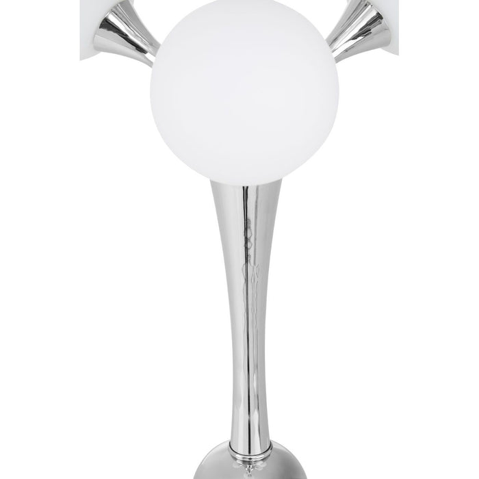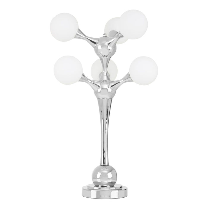 Standing on a round tiered base, the Heba 6 light table lamp has a chrome finish steel construction that reflects metallic silver hues. The ball detailing at the base and top give it a striking visual appeal. Each light of this lamp has a bowl shaped, white opal glass shade to create a soft, ambient glow. This tree design table lamp featuring metal and glass combination will make a distinctive statement in a contemporary luxe interior.