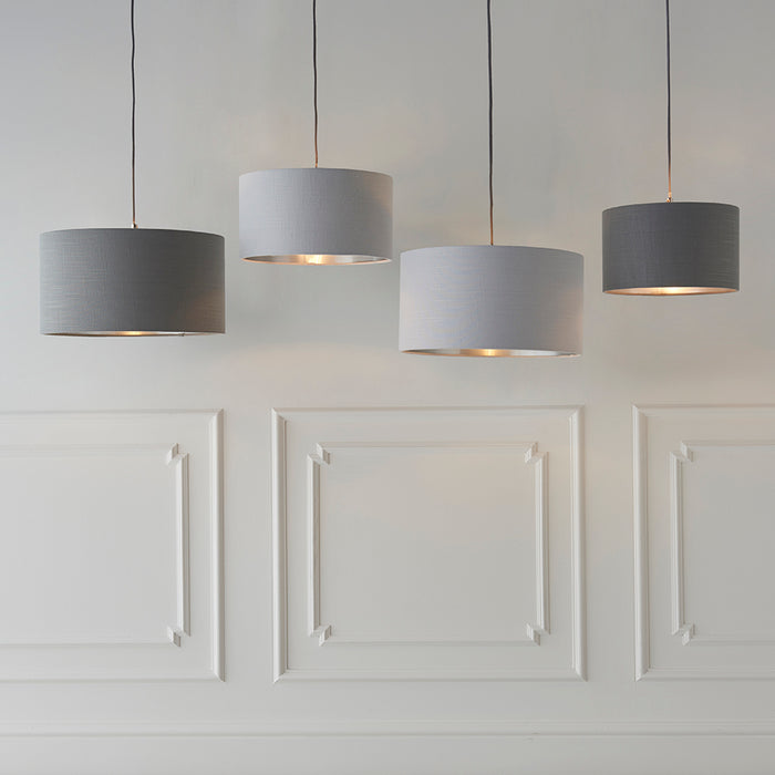 The Highclere cylinder shade is a sophisticated combination of charcoal linen mix fabric with a striking reflective brushed metallic inner. This statement shade is the perfect timeless addition to modern and classic homes of today.