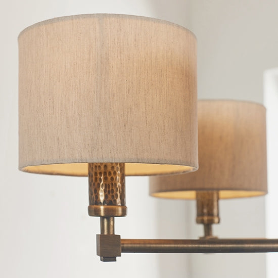 The Indara 5 light pendant features a hammered aged bronze effect fitting, with natural linen effect fabric shades. A stylish fitting which would suit a variety of styles and settings. It is dimmable and compatible with LED lamps.