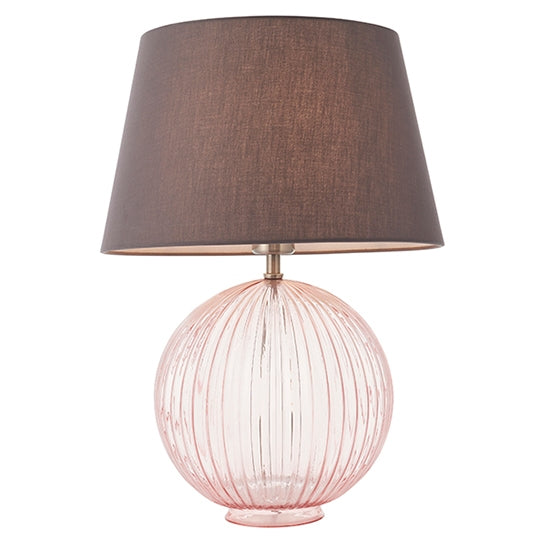 Incorporates 10% saving when base and shade bought together. A striking table lamp with a distinctive ducky pink tinted ribbed sphere glass base, finished with satin nickel fittings. Paired with the rich cotton Evie charcoal shade to complete the look.