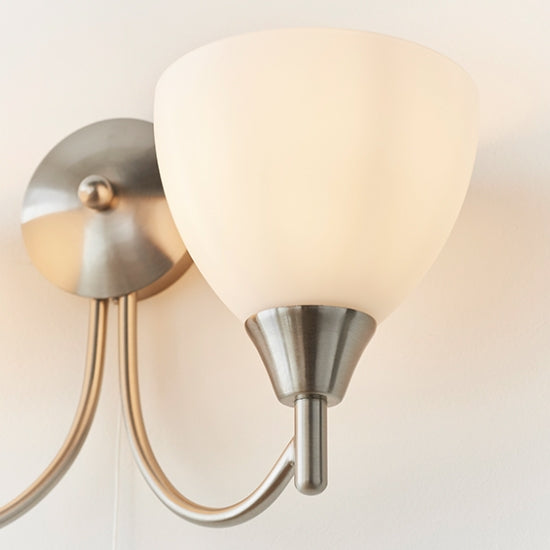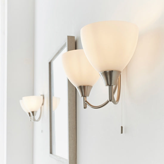 The Alton twin wall light is finished in a soft satin chrome and complemented by matt opal glass shades. With easy reach pull cord switch.