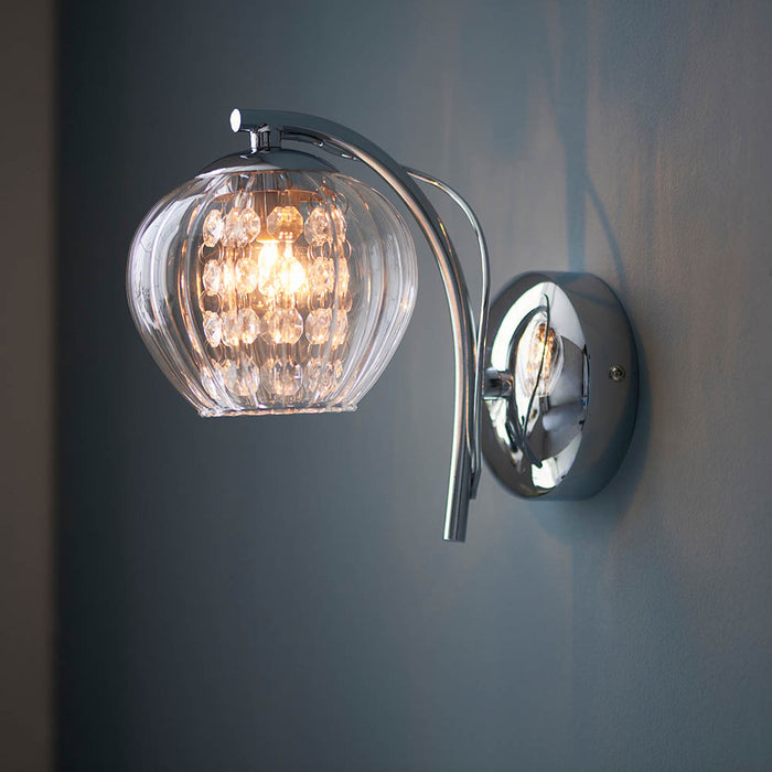 Glass details beautifully refract the light in this decorative collection bringing a warm glow to your room. This wall light has stylish curved arm with ribbed glass shade; other family items also available.