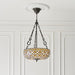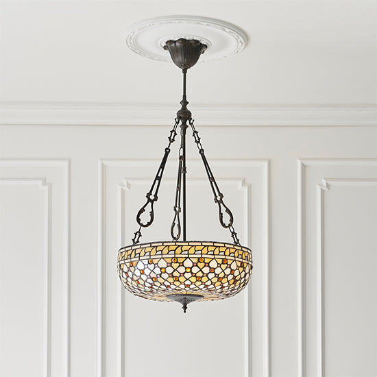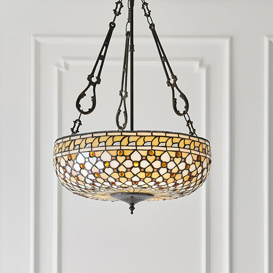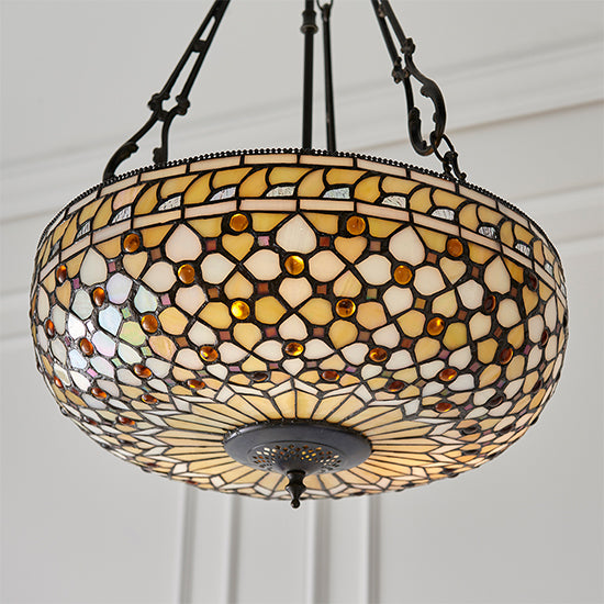 Mille Feux takes its name from the French for thousand lights. This large inverted pendant light uses many pieces of cream tiffany art glass in a geometric pattern, and is inlaid with glass bead work. Dimmable and compatible with LED lamps.