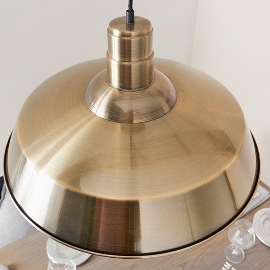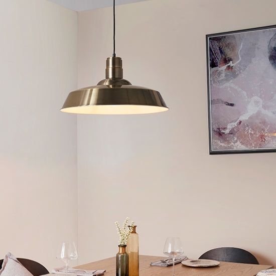 A shiny metal pendant with an antique brass finish. An adjustable drop, dimmable and suitable for use with LED lamps.