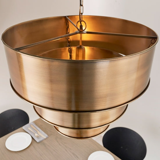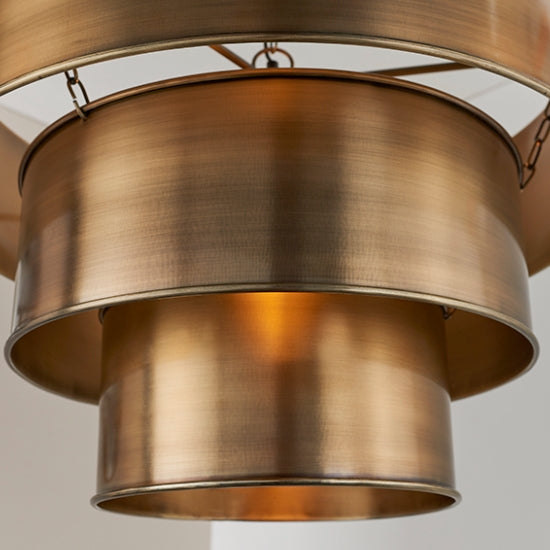 An eye catching pendant formed from 3 cylindrical tiered shades, all hanging from a metal chain and finished in an aged brass plate. Compatible with LED lamps and dimmable.