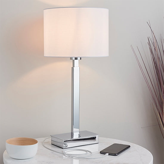 Norton Vintage White Cylinder Shade Table Lamp With USB In Polished Chrome