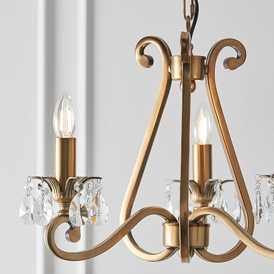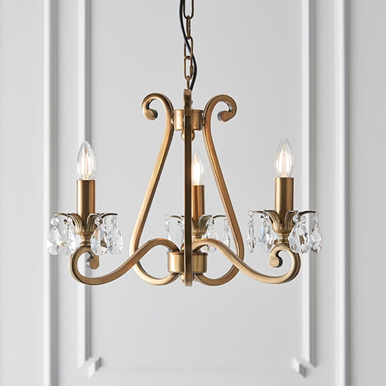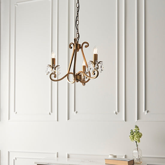 A 3 light pendant from the Oksana antique brass range. Features faceted lead crystal droplets around the lamp holder on each decorative arm. Matching items available and compatible with LED lamps.
