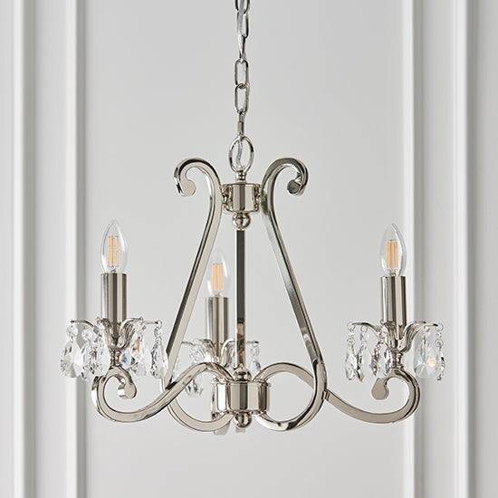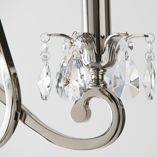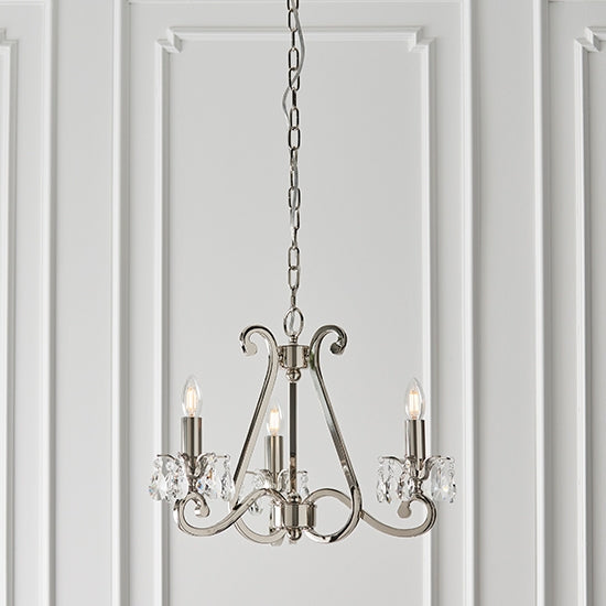 A 3 light pendant from the Oksana nickel range. Features faceted lead crystal droplets around the lamp holder on each decorative arm. Matching items available and compatible with LED lamps.