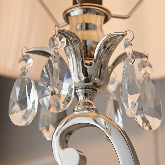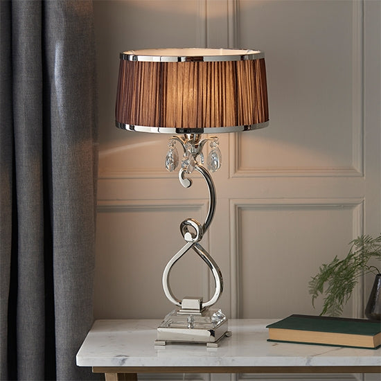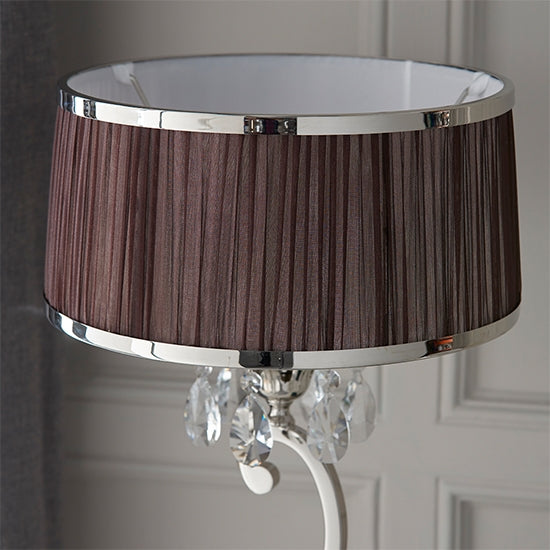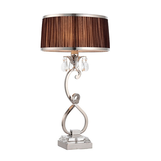 A medium table lamp from the Oksana nickel range. Features faceted lead crystal droplets, a decorative stem base and a Chocolate pleated shade with a polished nickel trim. Matching items available and compatible with LED lamps.