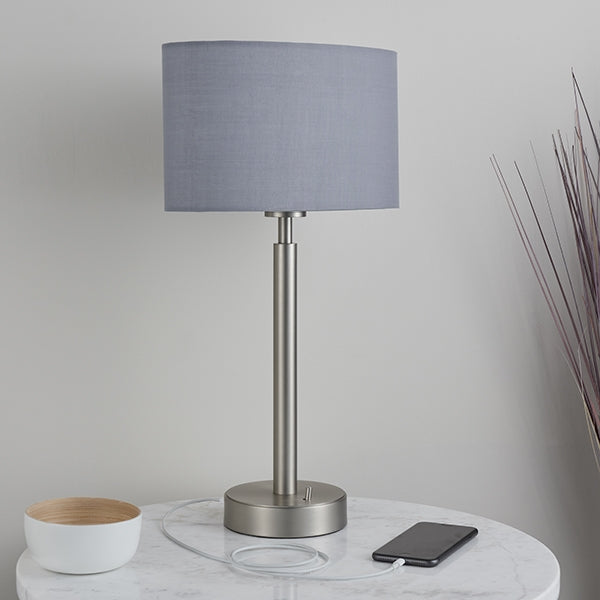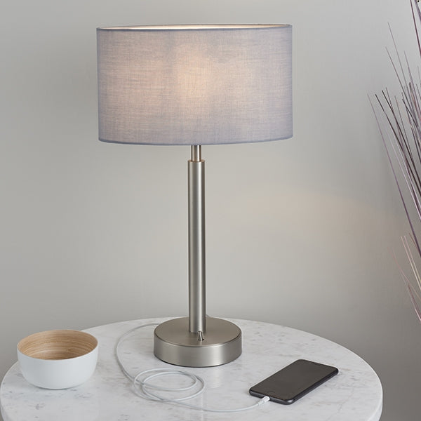 The Owen USB table light is a timeless, modern, clean line design. The perfect addition to boutique style bedrooms or living areas, finished in smart matt nickel plating, twinned with a Grey oval shade. Featuring an easily accessible on/off switch and integrated USB socket for versatile mobile device charging by your bedside or wherever you need it.
