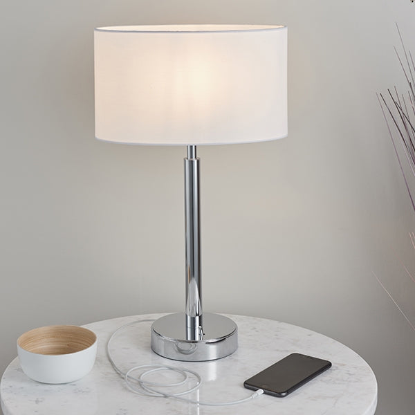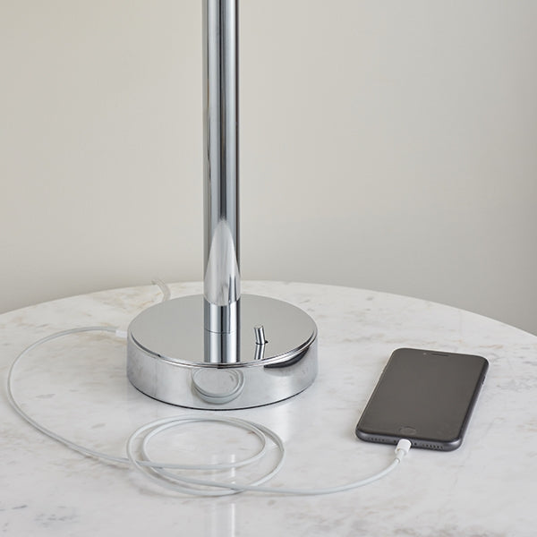 The Owen USB table light is a timeless, modern, clean line design. The perfect addition to boutique style bedrooms or living areas, finished in smart polished chrome plating, twinned with a vintage white oval shade. Featuring an easily accessible on/off switch and integrated USB socket for versatile mobile device charging by your bedside or wherever you need it.