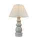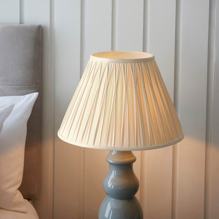 Provence table lamp finished in luxurious gloss blue grey glaze featuring a beautiful handmade pinch pleat 100% silk ivory 16 inch tapered shade.