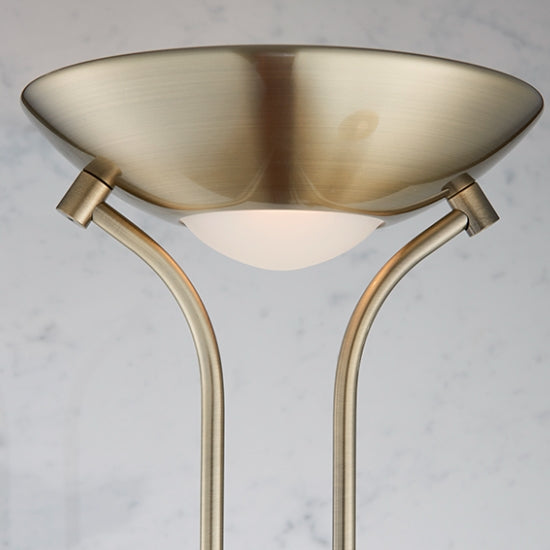 A tall 2 light floor lamp with a double stand supporting an uplighter as well as an adjustable branch holding a reading lamp. Antique brass finish metalwork with a opal glass diffuser, complete with an easy to reach double rotary dimmer switch. Other colour options available.