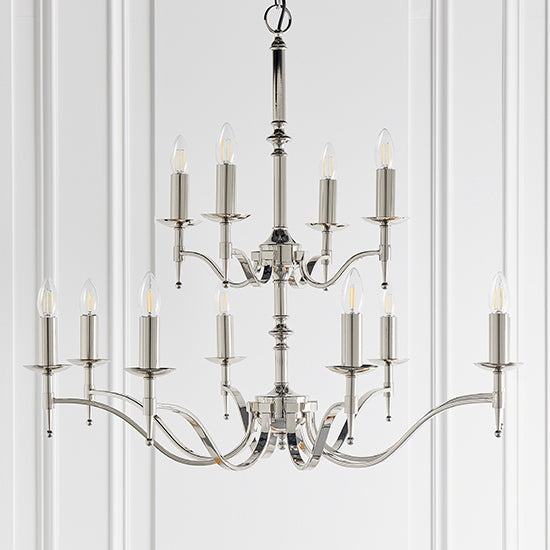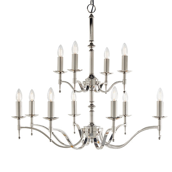 This elegant 12 light pendant from the Stanford Polished Nickel range has beautifully curved arms and simple clean detailing. Matching items available.
