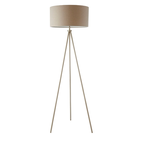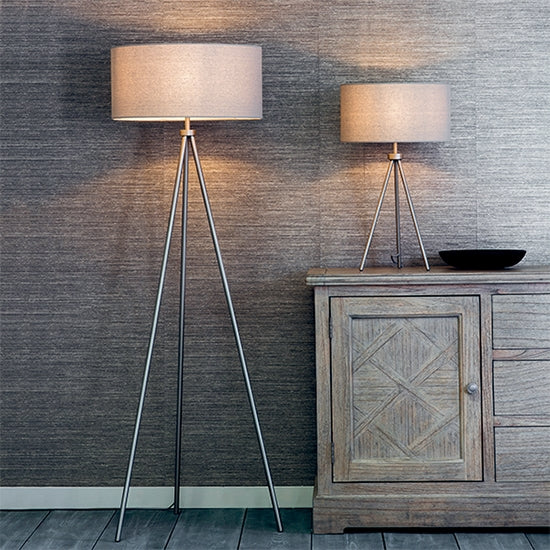 A simple yet stylish floor light in a tripod design with a matt nickel finish, and teamed with a grey linen effect shade. Compatible with LED lamps and matching items available.