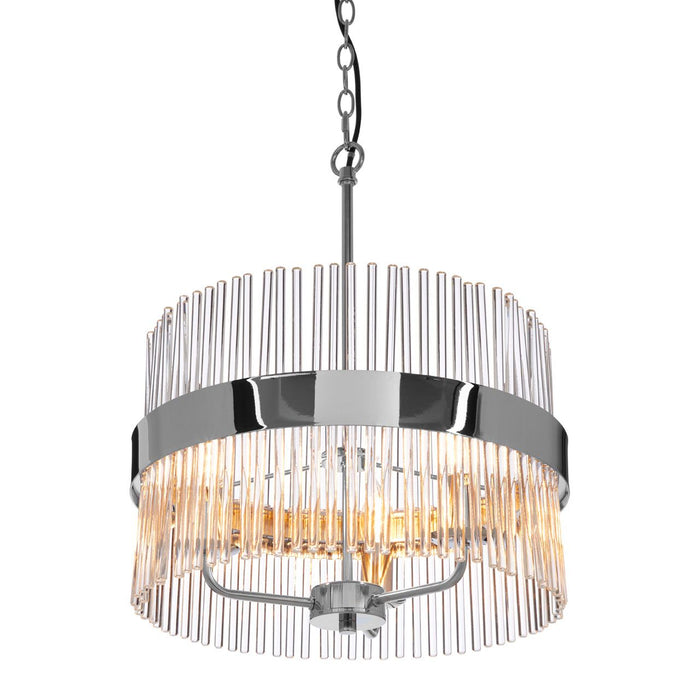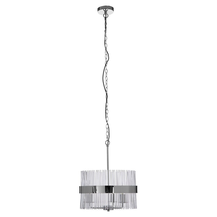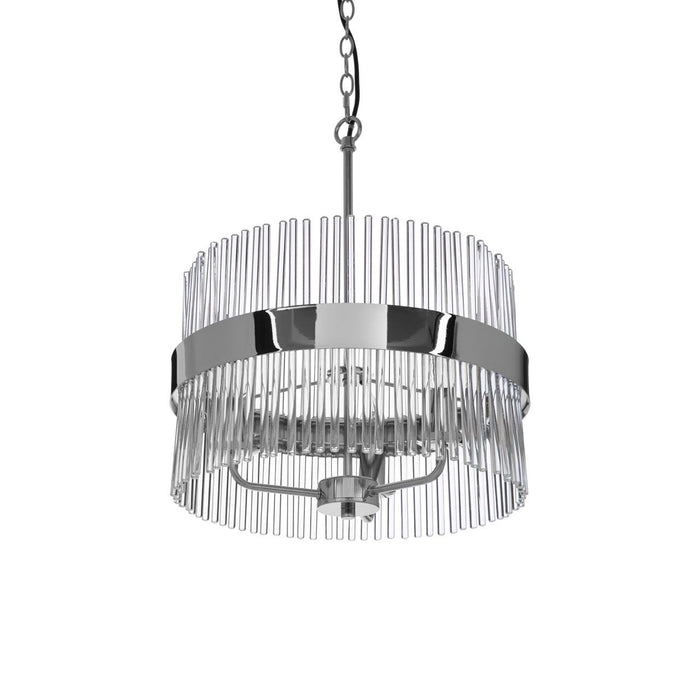 Suspended from an iron chain, this rounded pendant light features cutout crystal bars which will refract a warm glow. A metallic silver chrome band gives a smooth and refined aesthetic to the clear glass construction. Give a transitional grace to the home living with this circular pendant light featuring hand-cut glass drum shade.