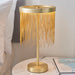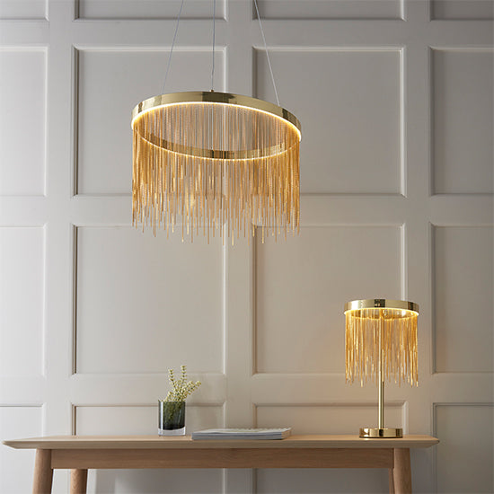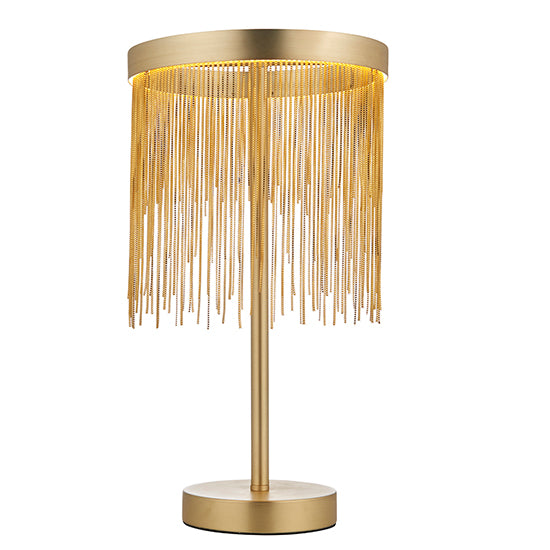 A beautiful table light finished in a satin brass effect plate. Delicate gold effect chains hang from a LED ring of light at differing lengths for a stunning shimmering effect.